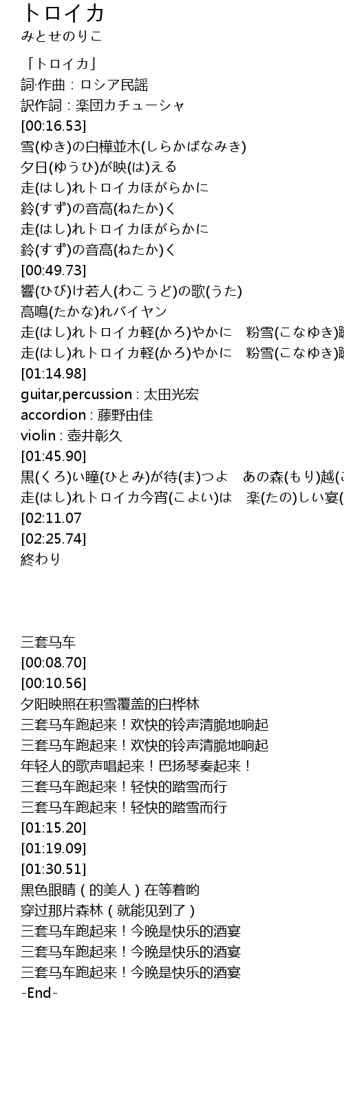 | [00:41.31] | 走(はし)れトロイカほがらかに 鈴(すず)の音高(ねたか)く |