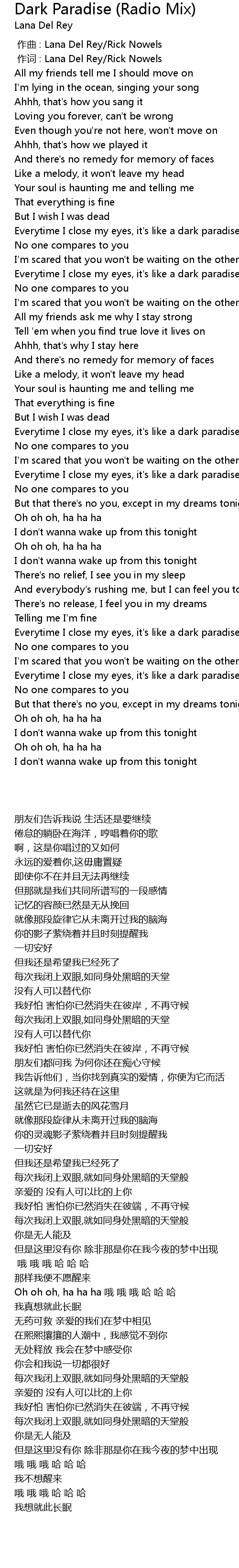 | [00:00.20] | 作词 : Lana Del Rey/Rick Nowels |