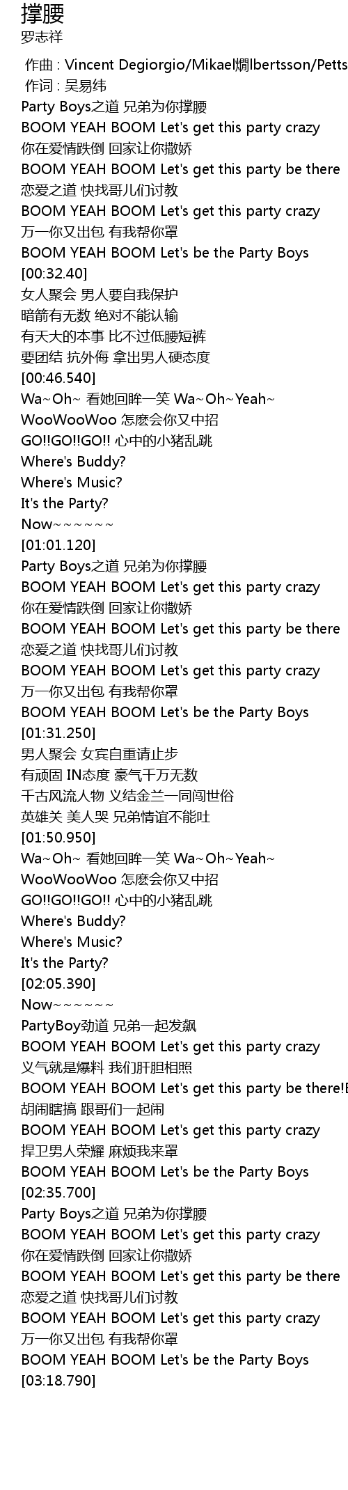 | [03:13.940] | BOOM YEAH BOOM Let' s be the Party Boys |