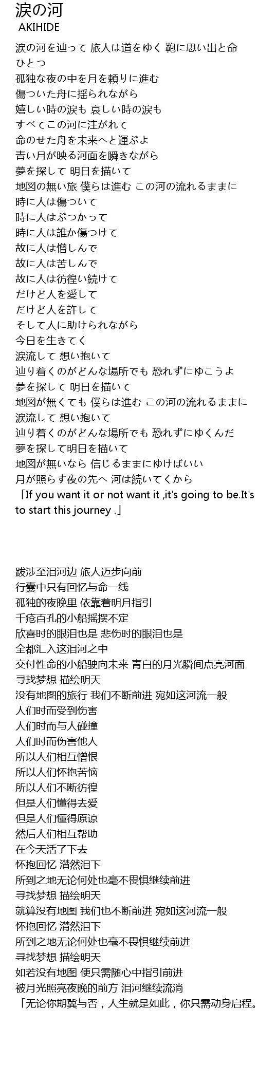 | [00:55.139] | 涙の河を辿って 旅人は道をゆく 鞄に思い出と命 ひとつ |