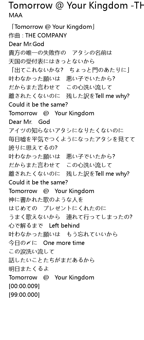 | [00:01.70] | 「Tomorrow @ Your Kingdom」 |