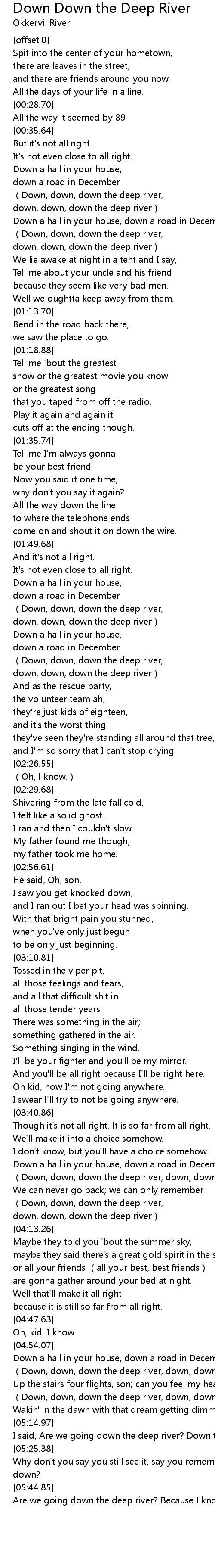 | [05:16.68] | I said, Are we going down the deep river? Down the deep river? |
