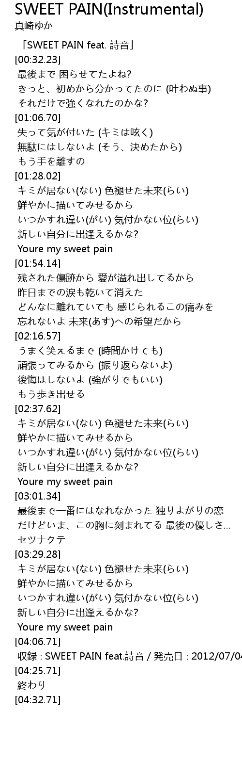 | [04:20.71] | shōu lù SWEET PAIN feat. shī yīn fā mài rì 2012 07 04 |