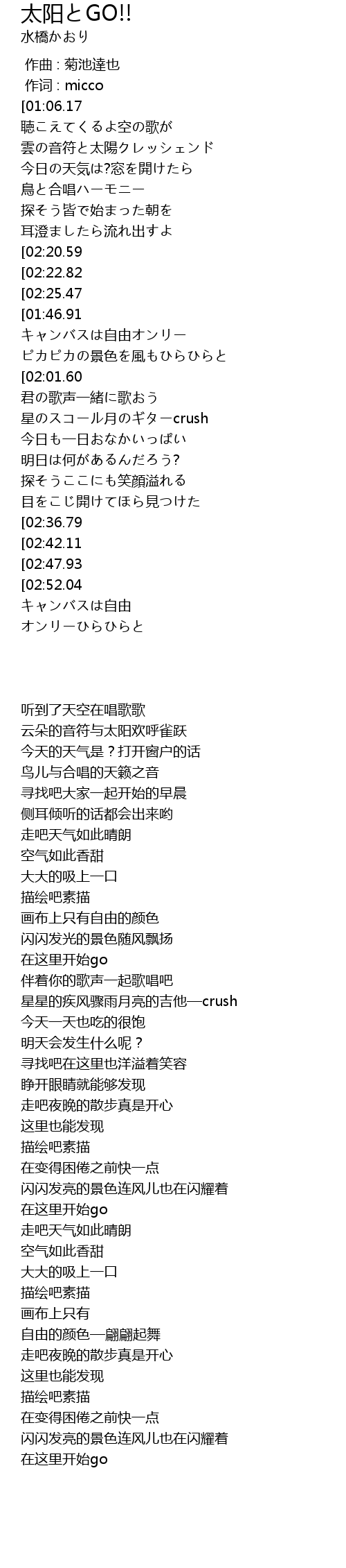 | [01:53.56][02:52.04] | キラキラの景色を風も輝いて |