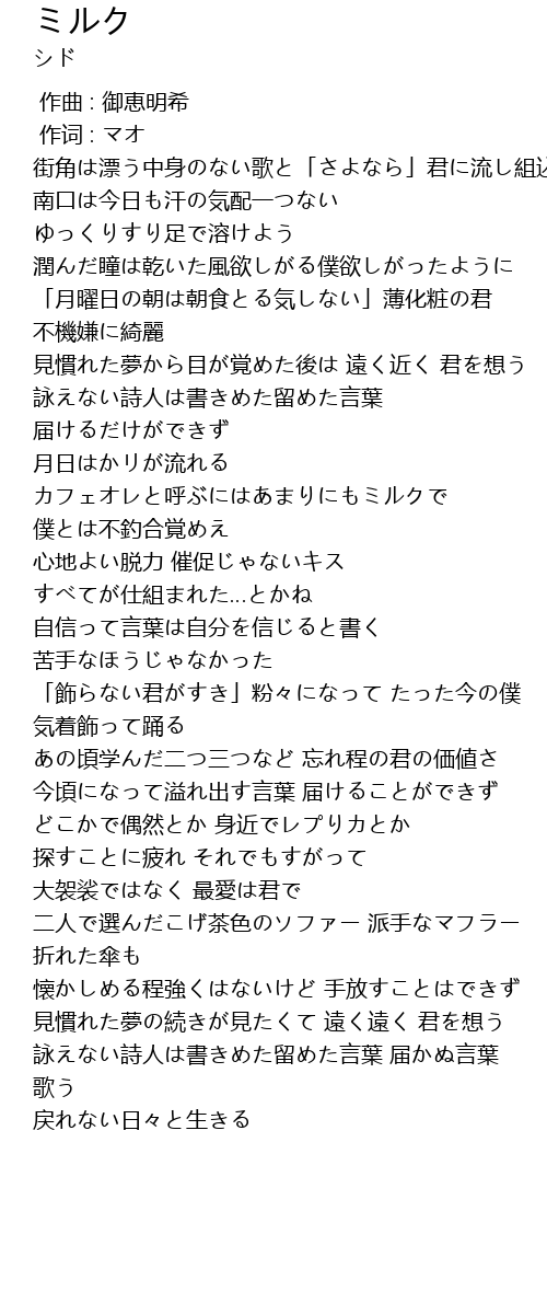 | [01:51.770] | カフェオレと呼ぶにはあまりにもミルクで 僕とは不釣合覚めえ |