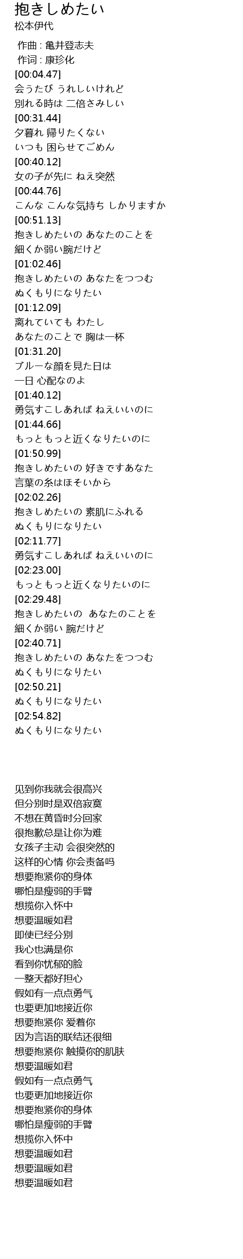 | [00:53.51] | 抱きしめたいの あなたのことを |
