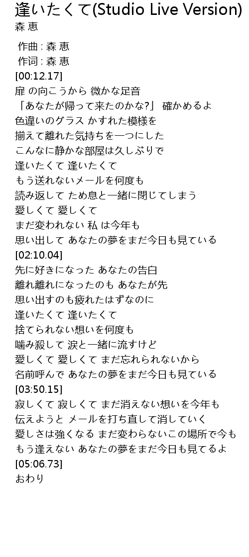 | [01:15.11] | 逢いたくて 逢いたくて |