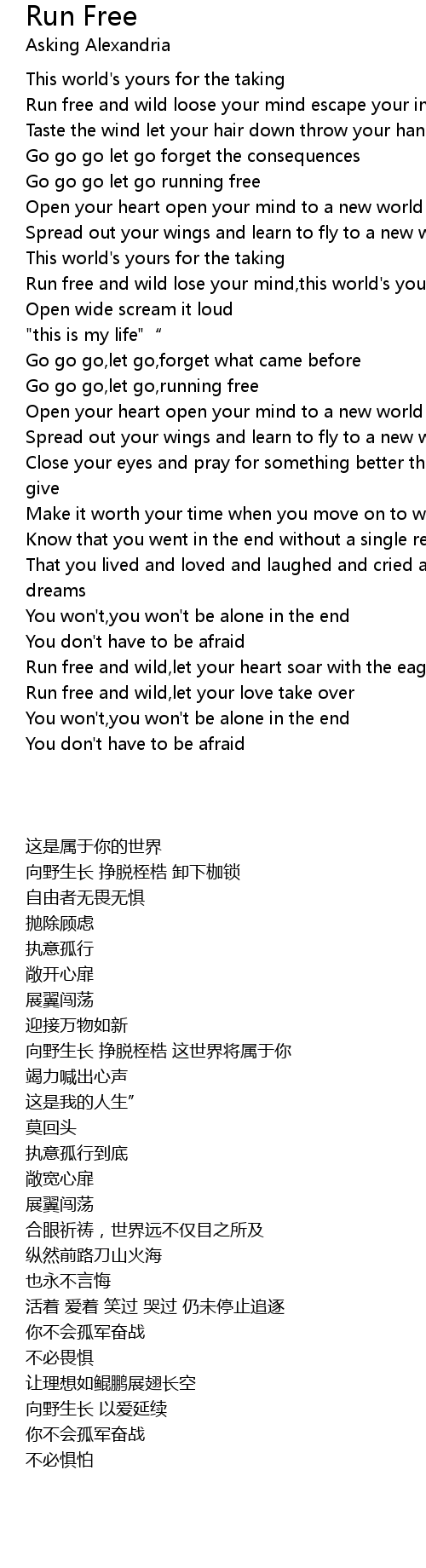 | [01:21.000] | Run free and wild lose your mind, this world' s yours for the taking |