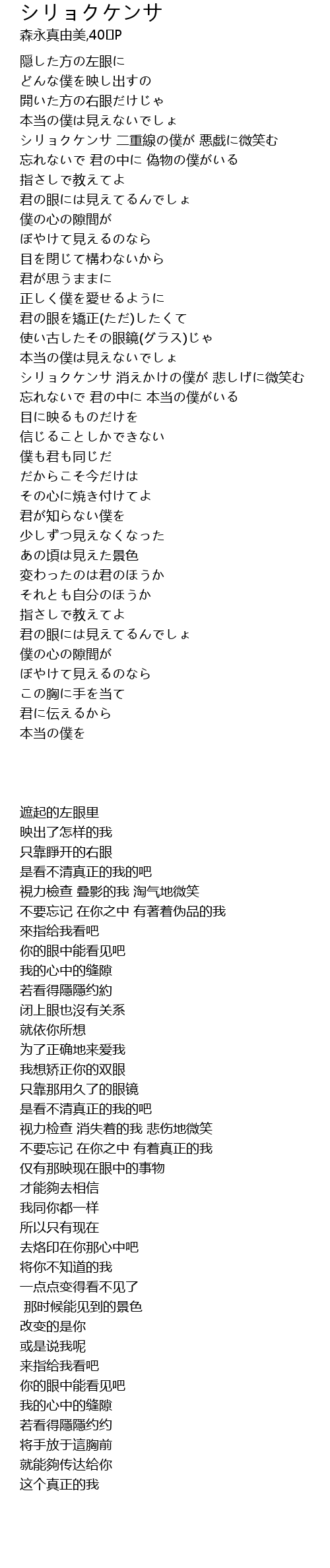 | [00:37.20] | シリョクケンサ 二重線の僕が 悪戯に微笑む |
