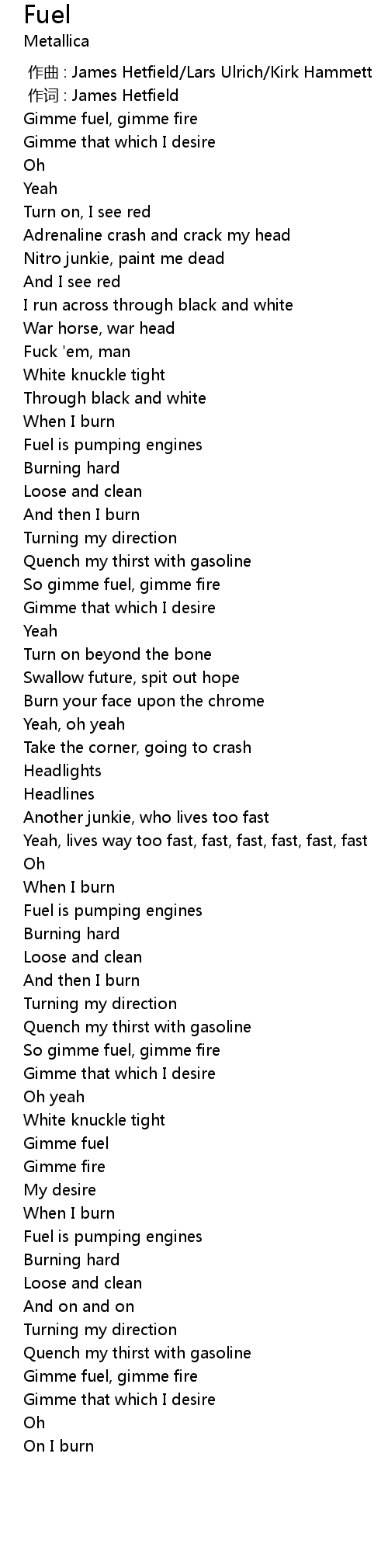 | [01:14.00] | So gimme fuel, gimme fire |