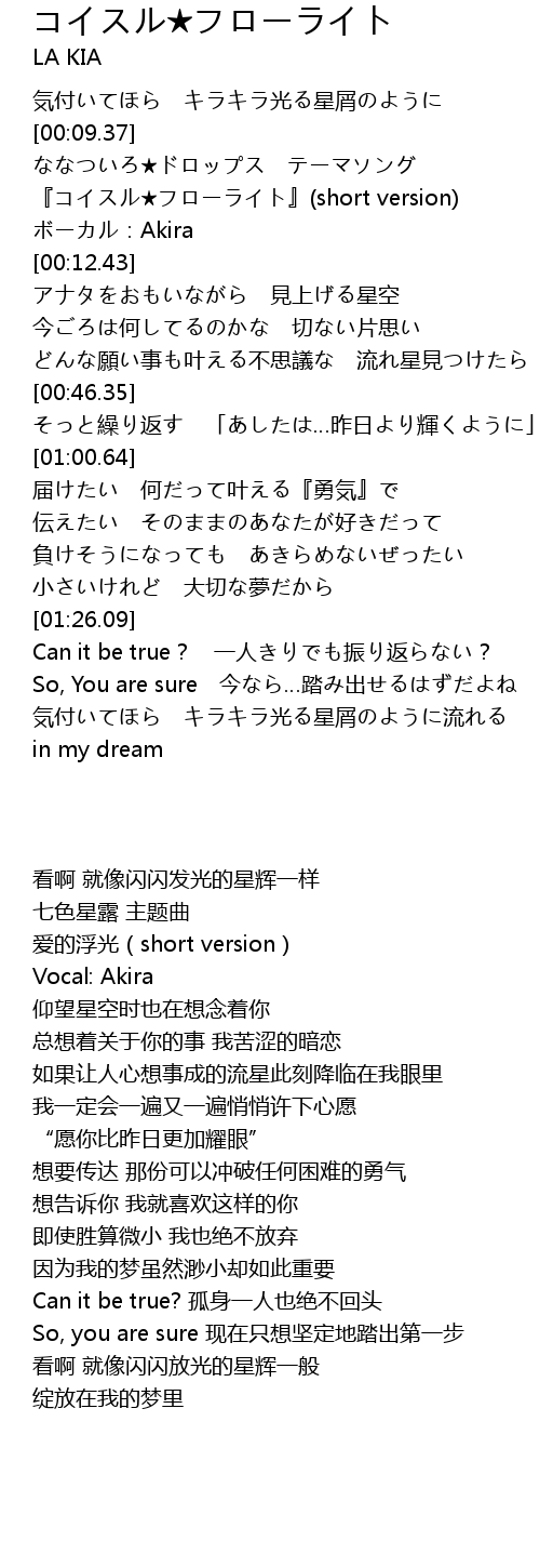 | [01:39.11] | 気付いてほら キラキラ光る星屑のように流れる |