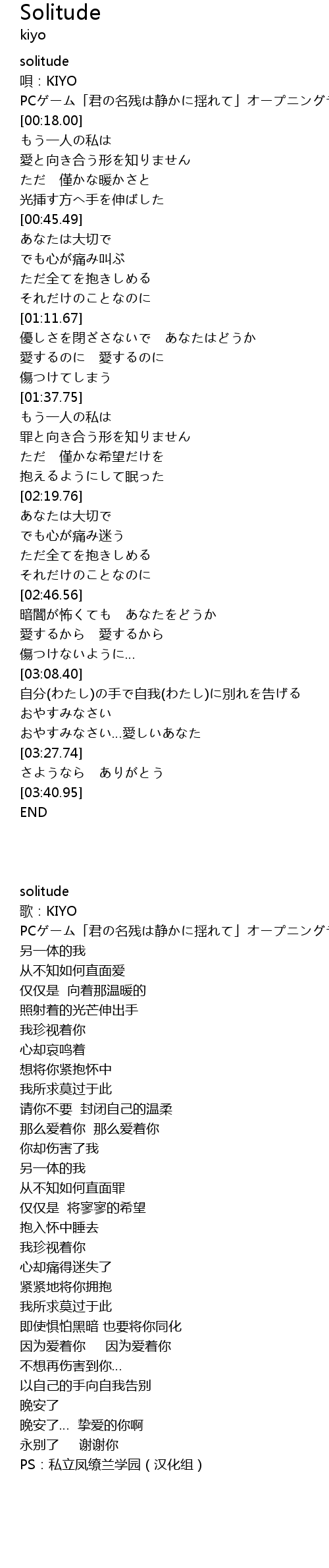 | [00:15.00] | PCゲーム「君の名残は静かに揺れて」オープニングテーマ |