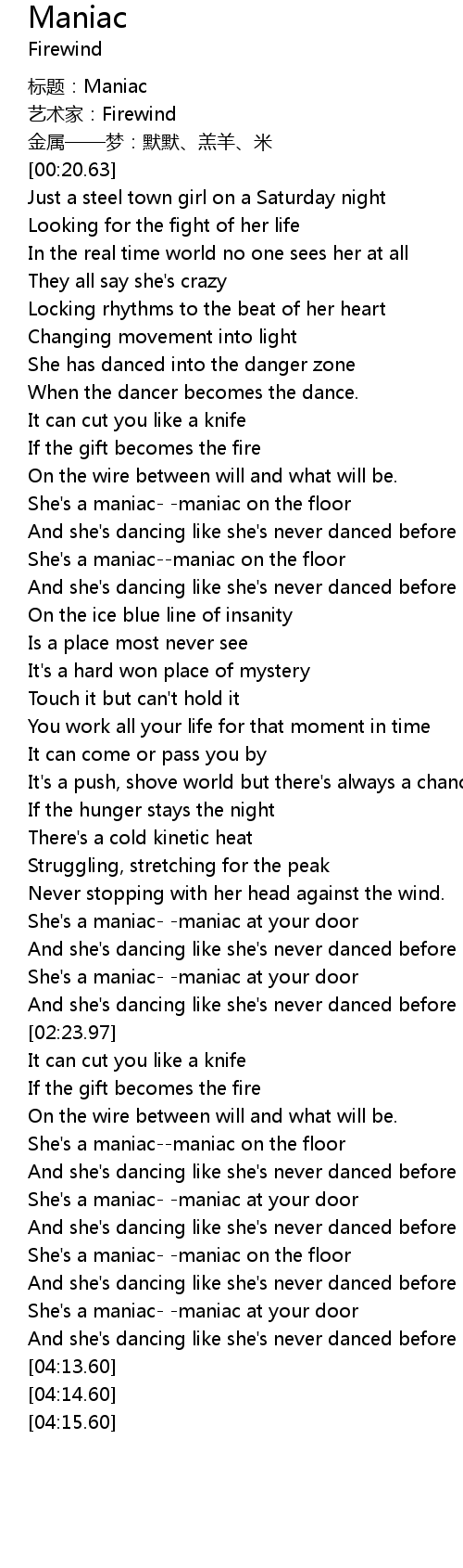 | [03:23.17] | She' s a maniacmaniac on the floor |