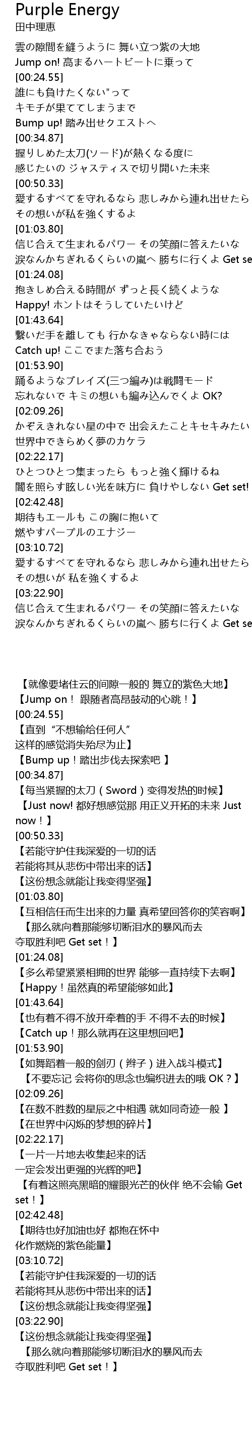 | [02:56.81] | 期待もエールも この胸に抱いて 燃やすパープルのエナジー |