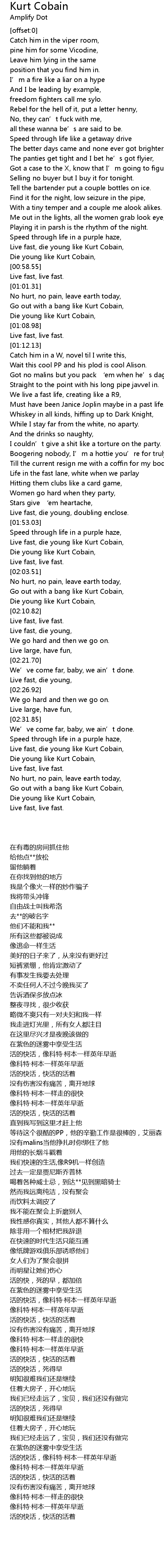 | [01:55.85] | Live fast, die young like Kurt Cobain, |