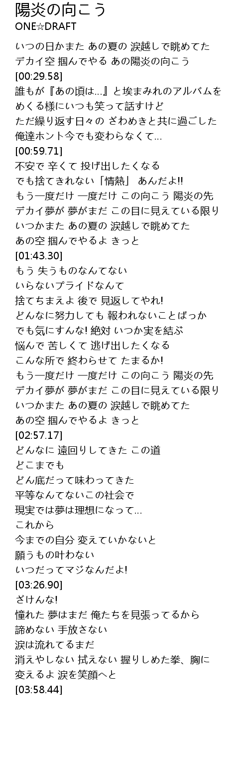 | [00:21.94] | デカイ空 掴んでやる あの陽炎の向こう |