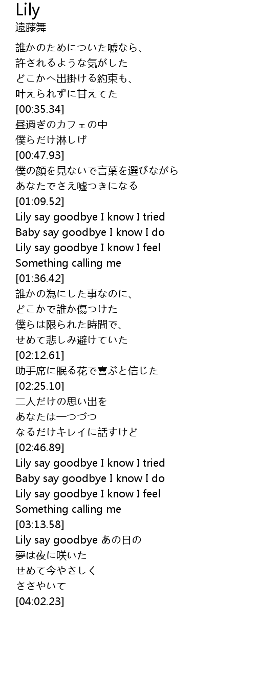 | [03:00.56] | Lily say goodbye I know I feel |