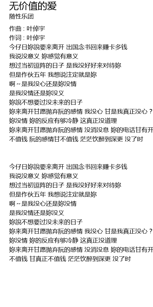 | 不值钱 阮的感情甘不值钱 茫茫饮醉到深更 没了时 | |