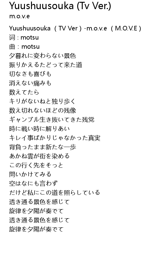 | [00:00.00] | Yuushuusouka TV Ver m. o. v. e M. O. V. E |