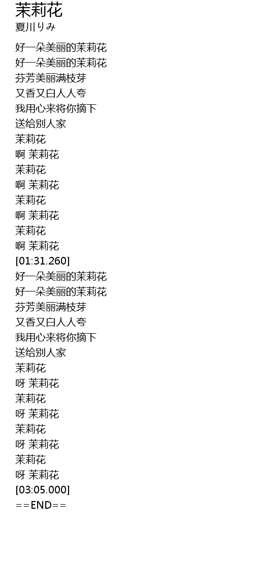 | [01:58.750] | 好一朵美丽的茉莉花 |