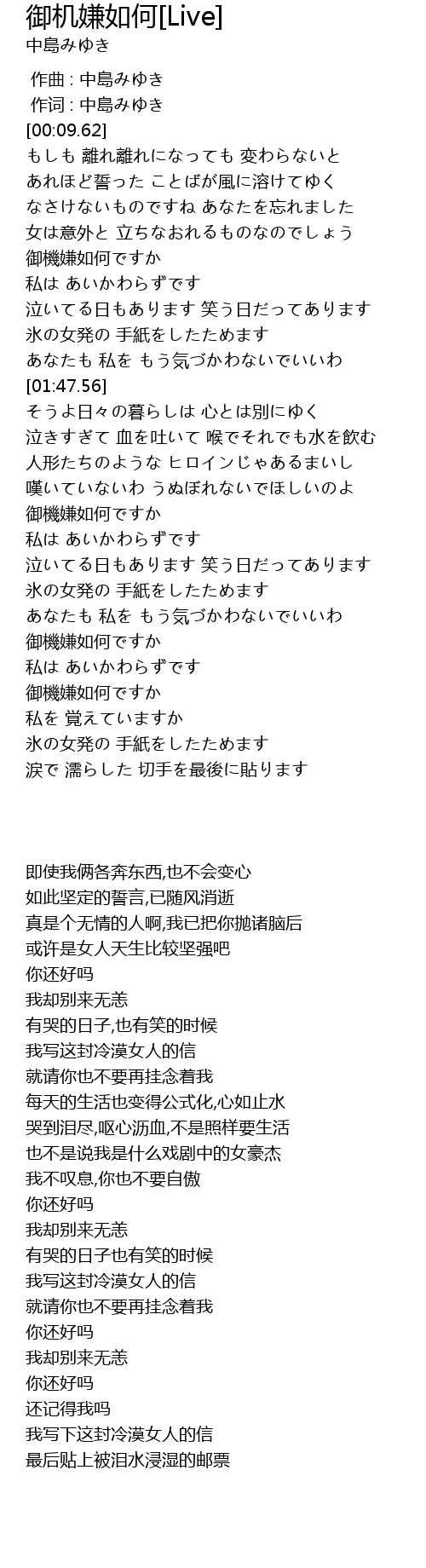 | [01:30.27] | 氷の女発の 手紙をしたためます |