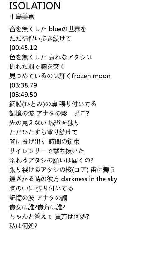 | [00:46.24][03:38.79] | 砕け散る優しい手で この躰 |