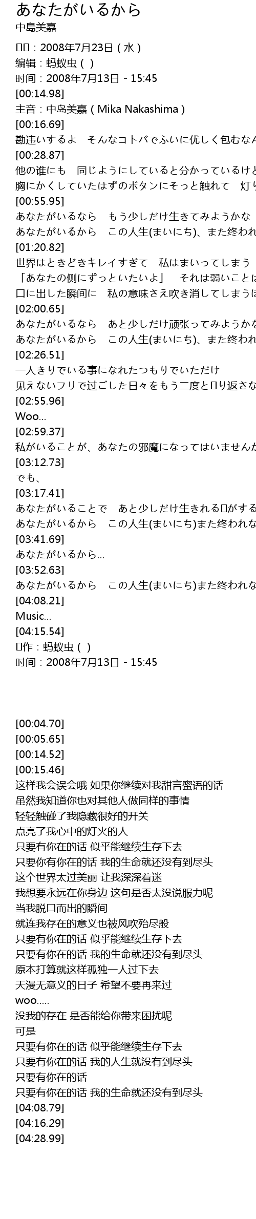 | [00:15.46] | 主音:中岛美嘉(Mika Nakashima) |