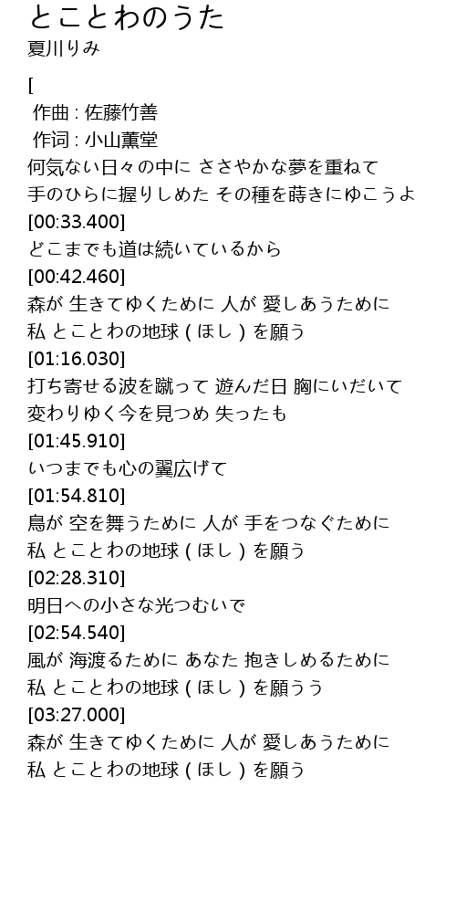 | [03:50.470] | 私 とことわの地球(ほし)を願う |