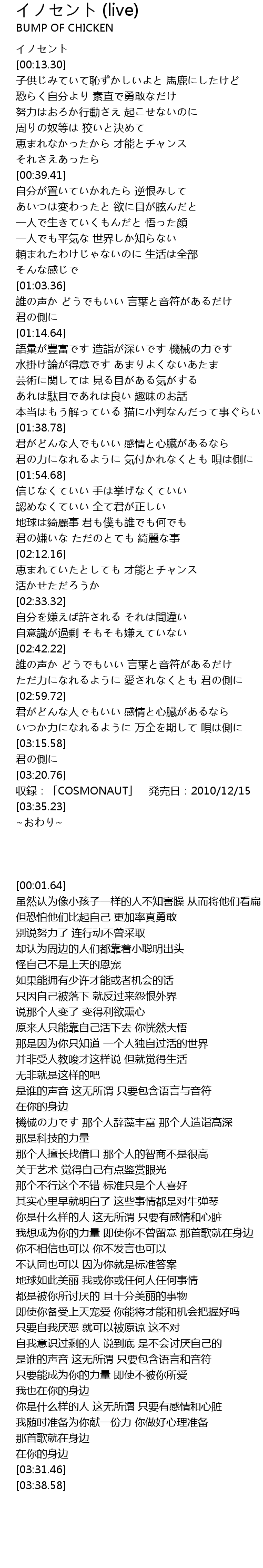 | [03:31.46] | 収録:「COSMONAUT」 発売日:2010/12/15 |