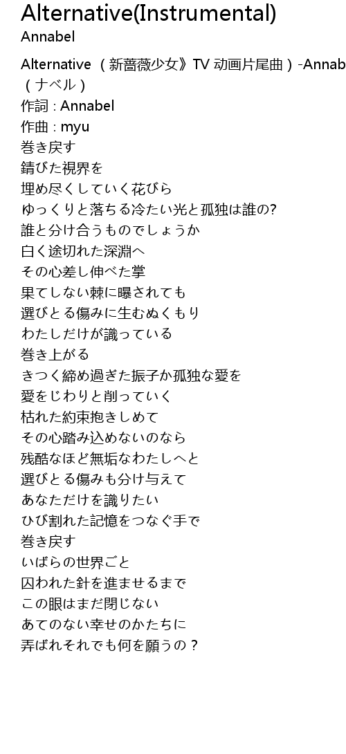| [00:00.00] | Alternative (新蔷薇少女》TV 动画片尾曲)-Annabel (ナベル) |
