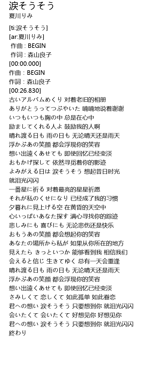 | [03:30.310] | 君への想い 涙そうそう 只要想到你 就泪光闪闪 |