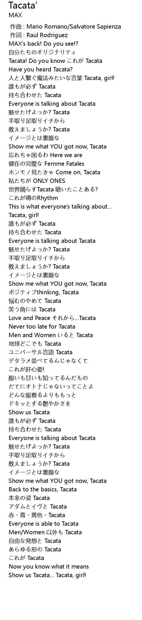 | [00:54.770] | 世界踊らすTacata 聴いたことある? |