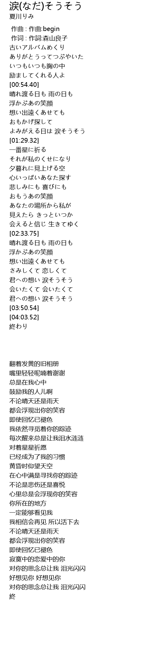 | [03:41.13] | 君への想い 涙そうそう |