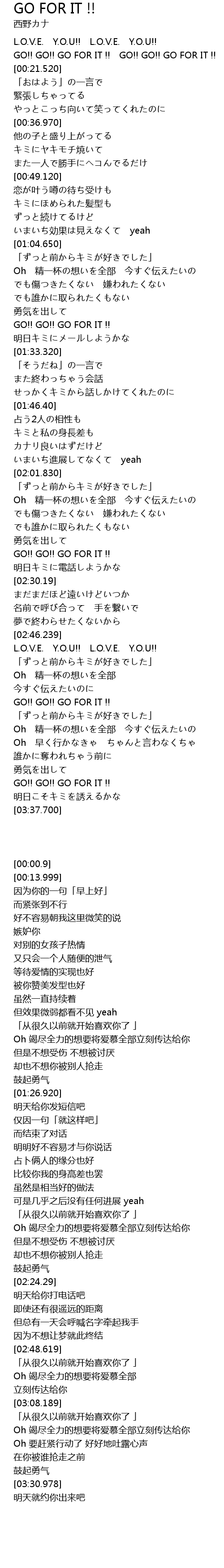 | [00:13.999] | GO!! GO!! GO FOR IT !! GO!! GO!! GO FOR IT !! |