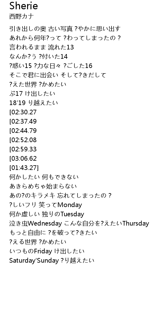 | [01:01.17][02:30.27][03:28.54] | Sherie Sherie 私らしさを取り?すの |
