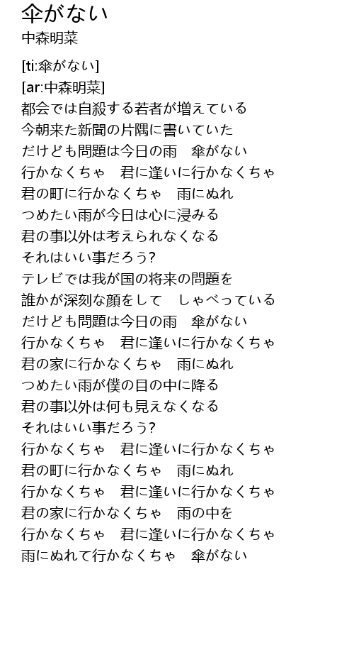 | [03:41.203] | だけども問題は今日の雨 傘がない |