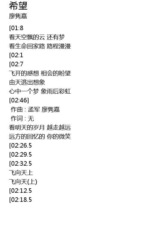 | [01:1.5][02:32.5] | 希望的翅膀 一天中张开 |