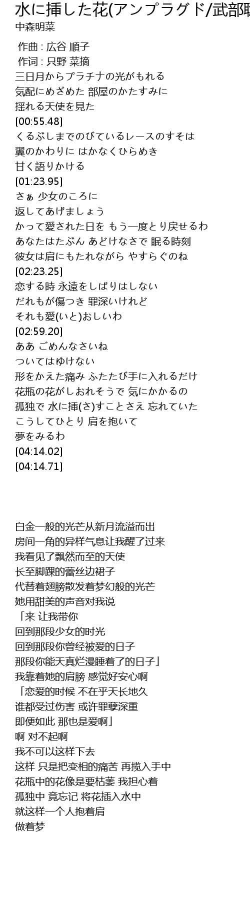 | [03:41.90] | 孤独で 水に挿(さ)すことさえ 忘れていた |