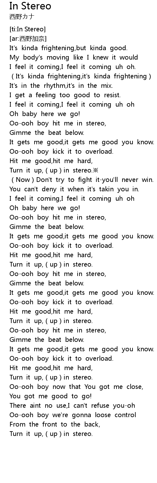| [00:57.299] | Ooooh boy hit me in stereo, |