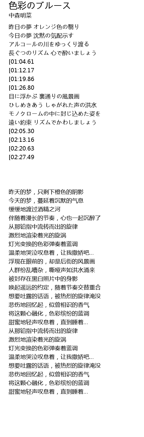 | [03:23.62][01:19.86] | あかりの色が奏でるブルース |