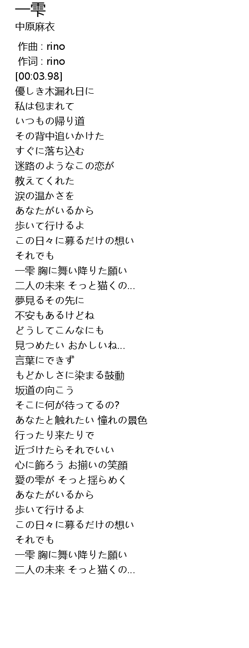 | [03:57.41] | 一雫 胸に舞い降りた願い |