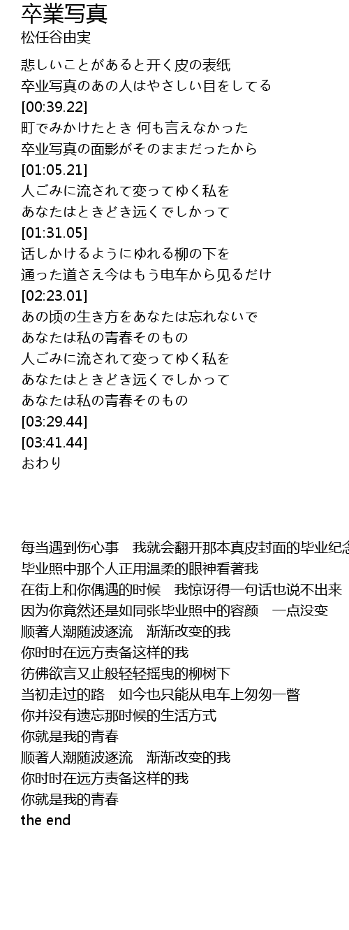 | [00:52.53] | 卒业写真の面影がそのままだったから |