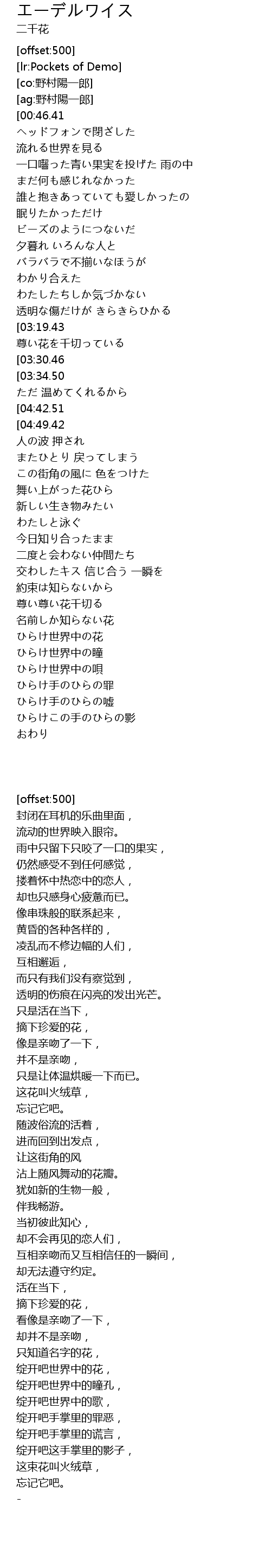 | [01:46.53][04:42.51] | この花はエーデルワイス |