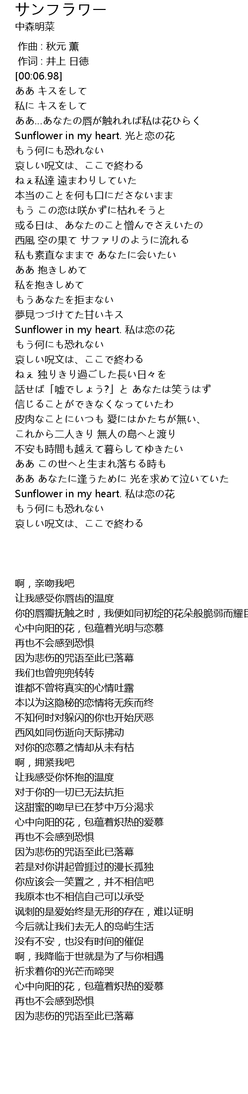 | [04:18.52] | Sunflower in my heart. si lian hua |