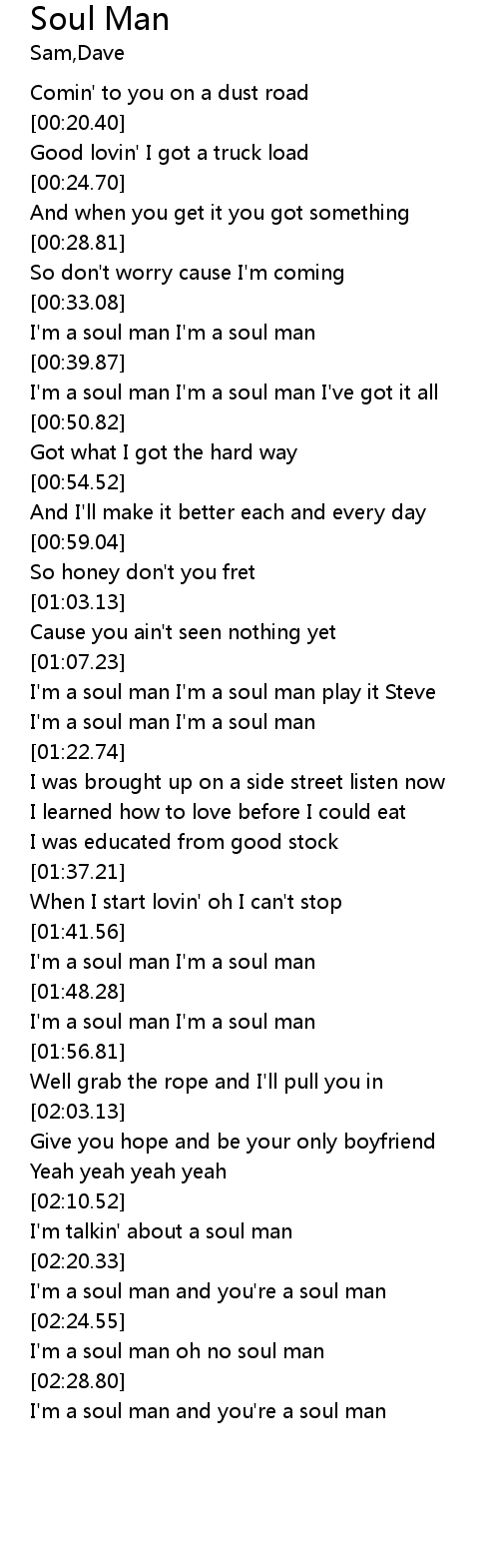 | [02:21.00] | I'm a soul man and you're a soul man |