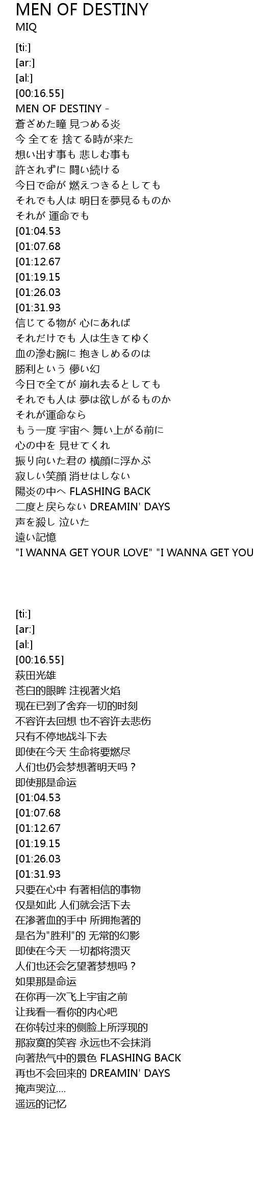 | [03:38.64][01:26.03] | xuǎn zhě MEN OF DESTINY |