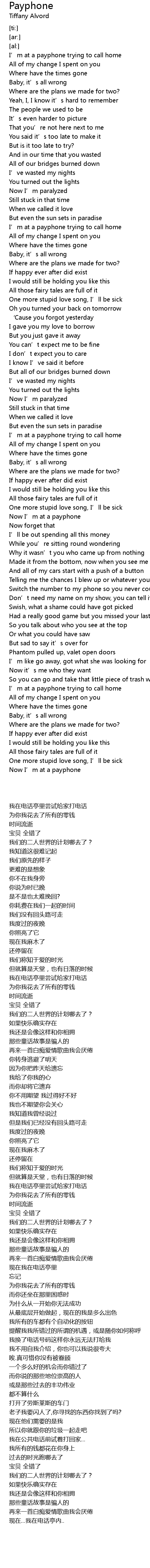 | [00:00.00] | I' m at a payphone trying to call home |