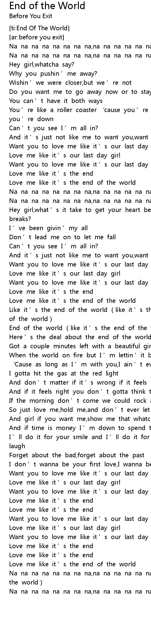 | [01:59.159] | End of the world (like it ’s the end of the world) |