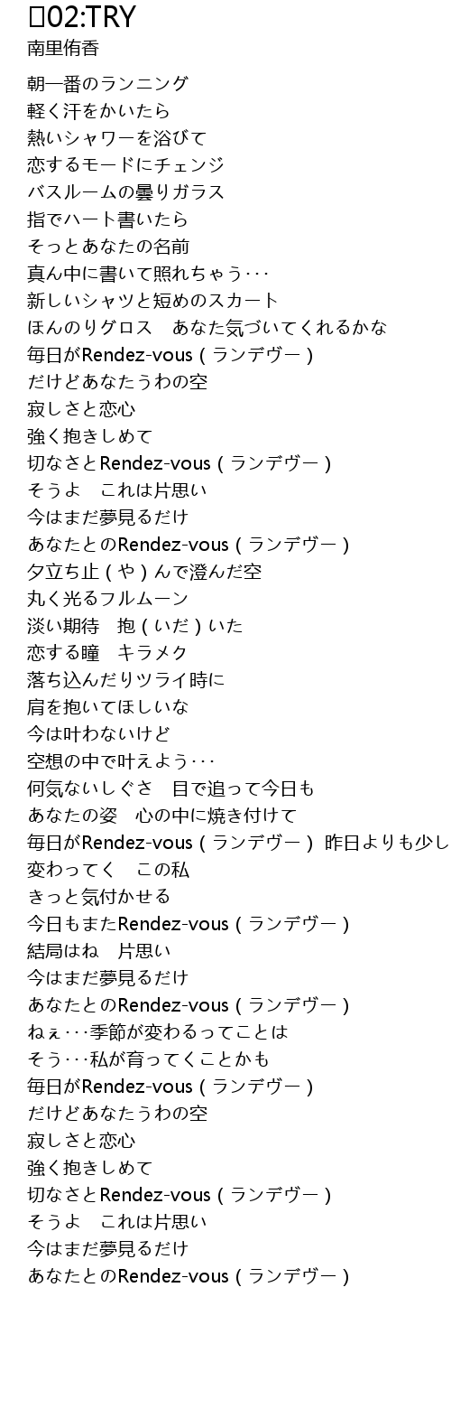 | [02:36.3] | 毎日がRendez-vous(ランデヴー) 昨日よりも少しずつ |