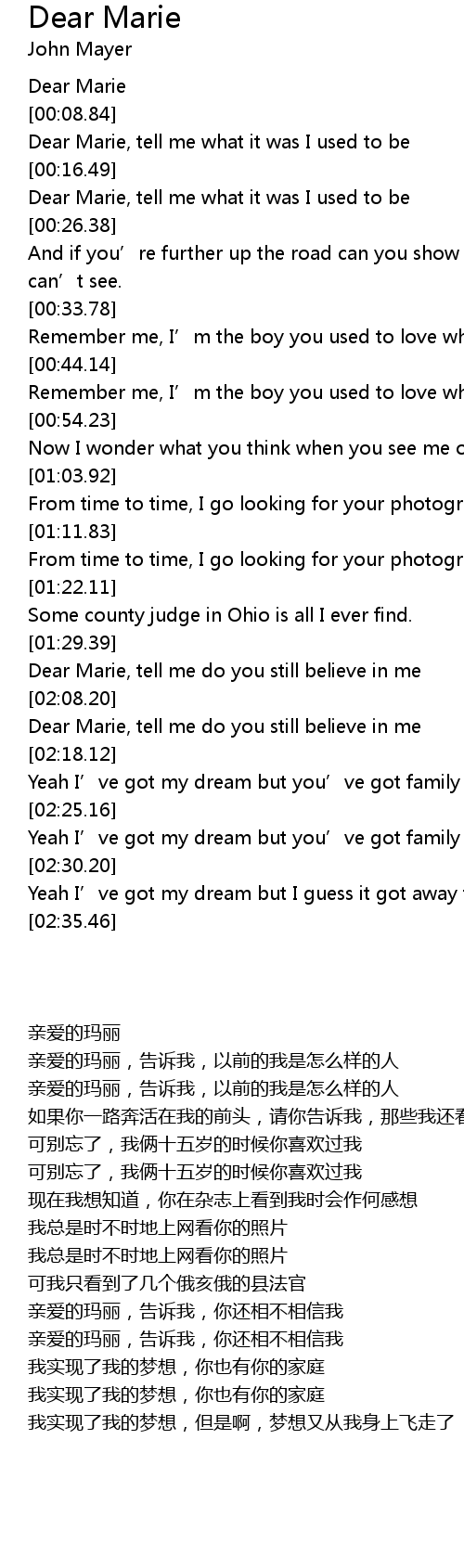 | [00:20.17] | Dear Marie, tell me what it was I used to be |